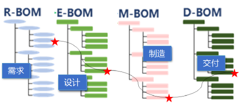 舉個(gè)例子,下圖中小紅星代表了我們要找的零件的一個(gè)具體信息,它在不同的業(yè)務(wù)階段可能在不同的“樹杈”上,但這四棵不同的“樹”之間可以通過(guò)固定的邏輯進(jìn)行溯源,因?yàn)樗鼈兊谋举|(zhì)都是產(chǎn)品的分解架構(gòu),只是視角不同而已。如此一來(lái),我們要找的目標(biāo)零件信息就不再是數(shù)據(jù)海洋中漂流的孤島,而是被X-BOM這棵大樹緊緊串聯(lián)在一起,不論漂到哪兒,都能找到自己的“前世今生”。